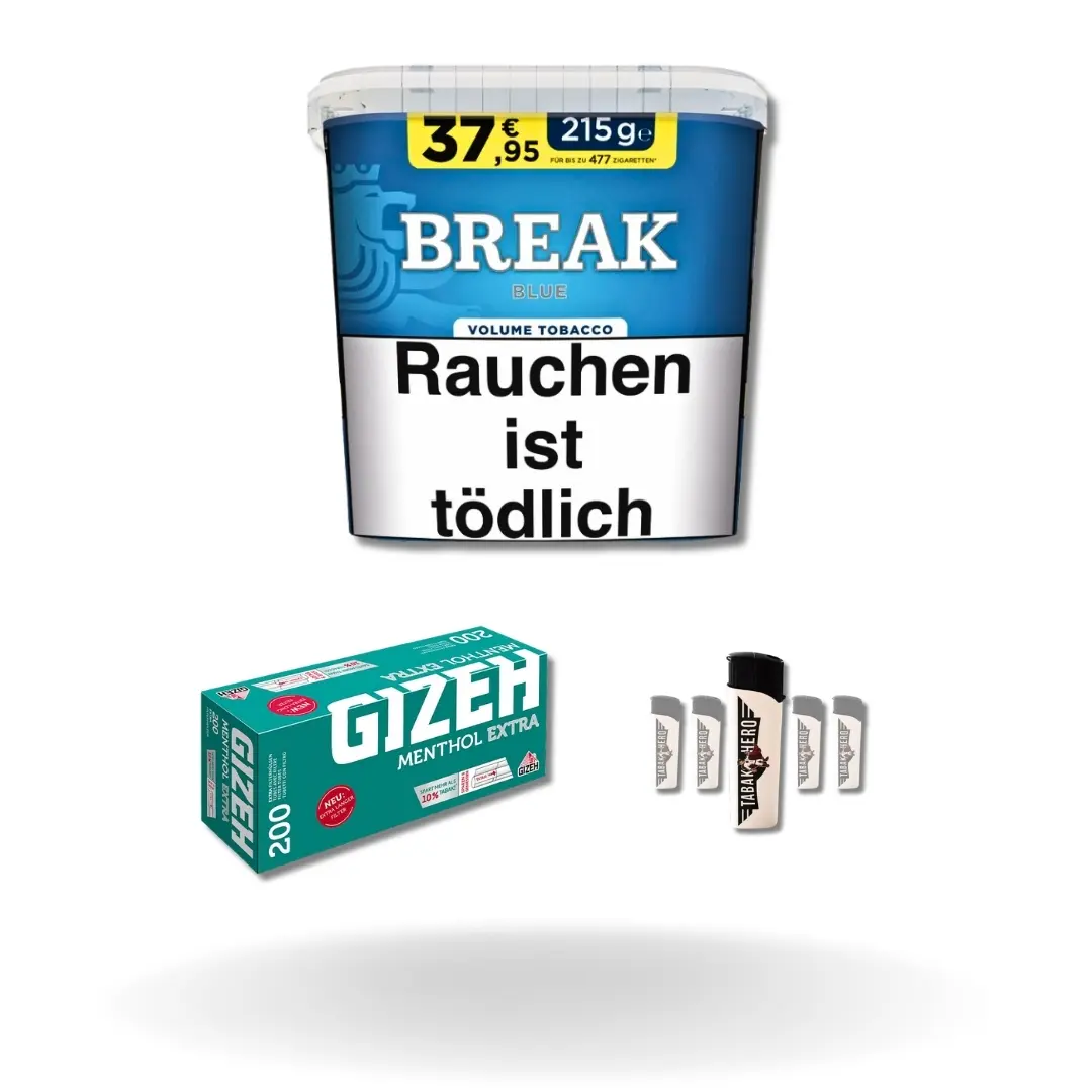Produktinformationen "Bundle: Break Blue Stopftabak (195g) + Gizeh Menthol Hülsen Extra Size (200 Stück) + Feuerzeuge (5 Stück) "