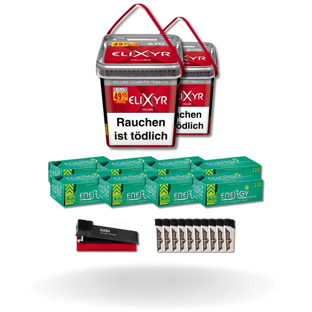 Bundle: Elixyr Red Stopftabak (2x260g) + Energy Plus Menthol Hülsen King Size (8x110 Stück) + Gizeh Stopfgerät + Feuerzeuge (10 Stück)